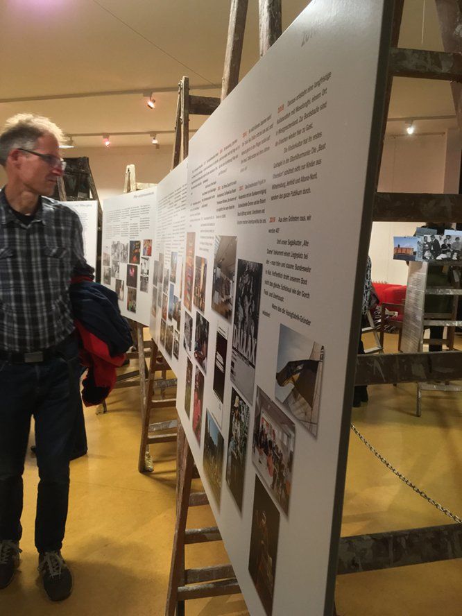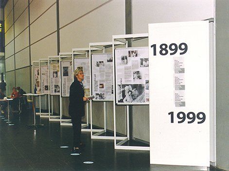 Ausstellungstafeln, Hintergrundtexte und Bildunterschriften, Ablauf von Element zu Element, Kojen und Vitrinen, Eröffnungselement und Schlussinformation mit Dank und Angaben zu den Urheberrechten. Parallel die